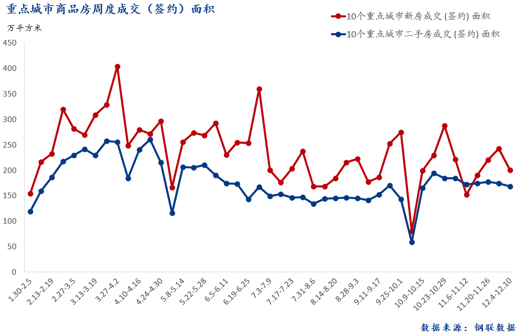 上周(12月4日-12月10日),10個重點城市新建商品房成交(簽約)面積總計200.08萬平方米,周環(huán)比降17.5%,環(huán)比止升轉降。