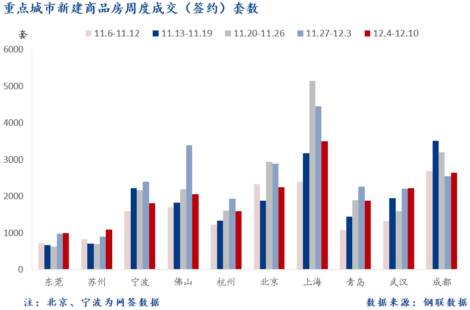 Mysteel統(tǒng)計了北京、上海、杭州、寧波、武漢、成都、佛山、青島、東莞及蘇州10個重點城市新建商品房周度成交(簽約)情況。具體如下:
