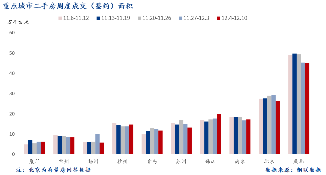 Mysteel統(tǒng)計了北京、杭州、成都、揚州、青島、南京、佛山、常州、蘇州及廈門10個重點城市二手房周度成交(簽約)情況。具體如下: