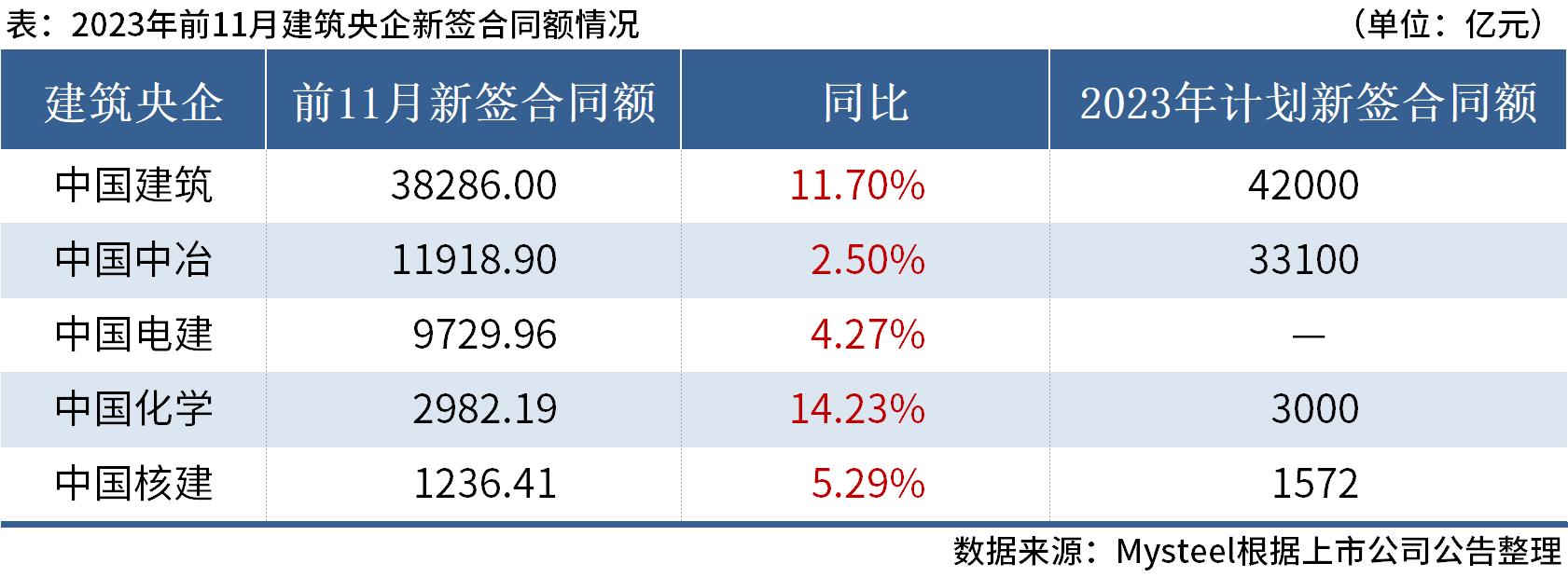 據(jù)Mysteel不完全統(tǒng)計,截至12月20日,共有5家建筑央企公布其1-11月新簽合同額情況,合計新簽合同額約64153.46億元,較去年同期(59013.81億元)增長8.71%。