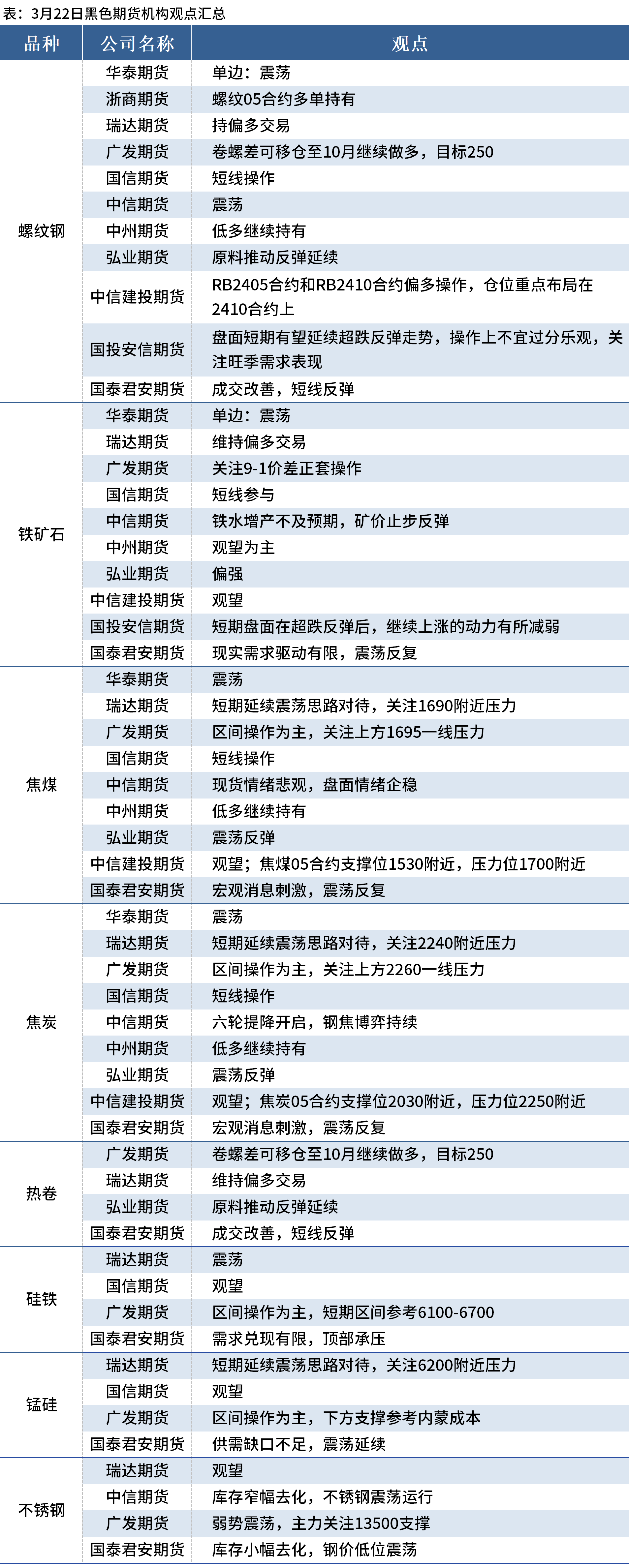 據(jù)Mysteel統(tǒng)計(jì)3月22日11家期貨機(jī)構(gòu)操作策略,其中多數(shù)機(jī)構(gòu)看多螺紋鋼,料鐵礦石震蕩運(yùn)行,焦煤、焦炭震蕩運(yùn)行。具體匯總內(nèi)容如下: