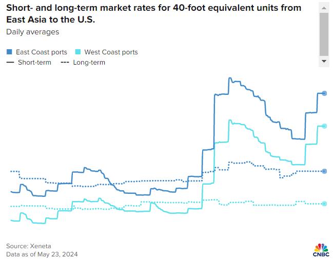 2024年初,紅海緊張局勢引發(fā)現(xiàn)貨運費急劇上升,隨后有所下降,但自4月底以來,通往美國海岸航線的現(xiàn)貨運費開始飆升,平均漲幅高達(dá)1500美元,運營商收取的最高合同價格可以達(dá)到一個月前的兩倍多。