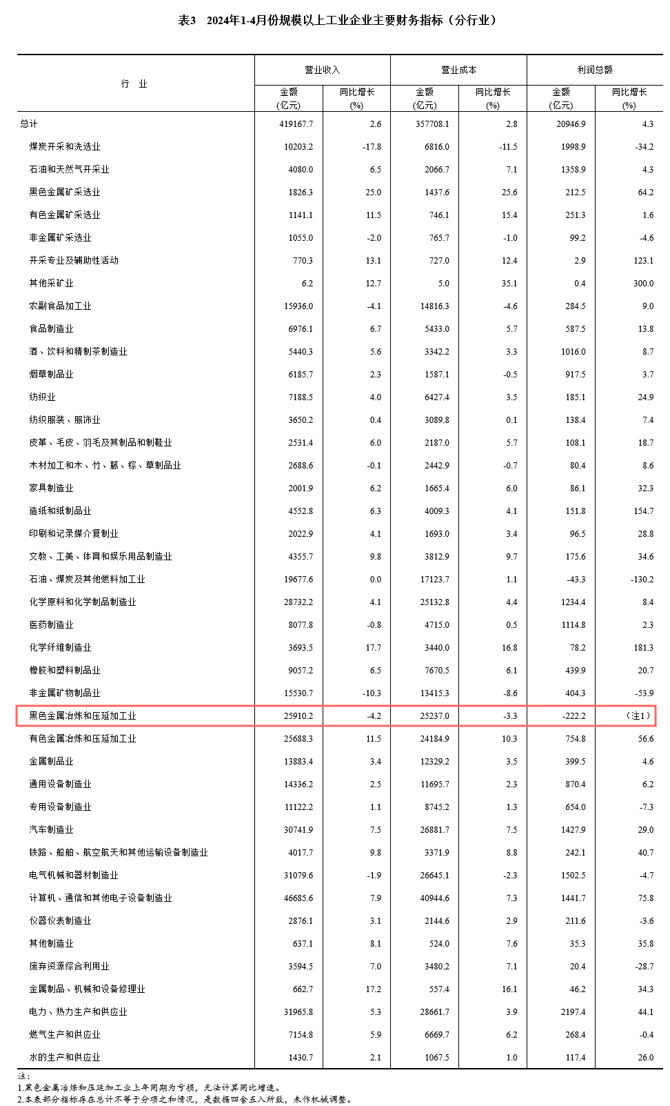 1-4月份,黑色金屬冶煉和壓延加工業(yè)利潤(rùn)總額-222.2億元。